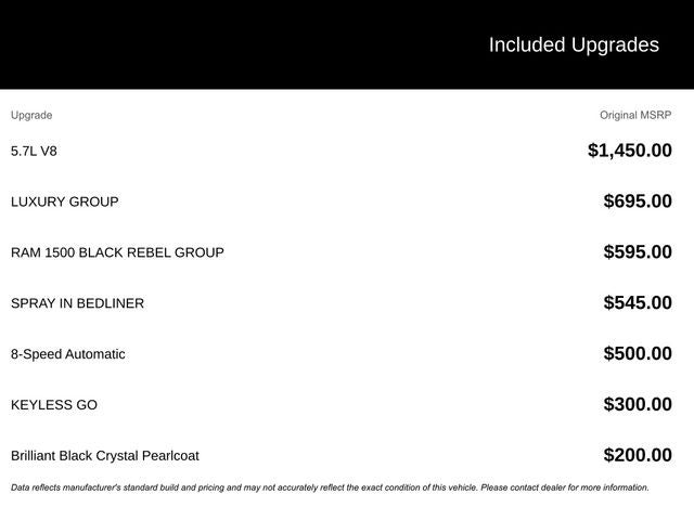 Auto-Dimming Exterior Mirrors, Black Powder-Coated Front Bumper, Dual Rear Exhaust w/Bright Tips, Exterior Mirrors Courtesy Lamps, Exterior Mirrors w/Supplemental Signals, Flat Black 5.7L Hemi Badge, Glove Box Lamp, LED Bed Lighting, Luxury Group, Overhead Console w/Garage Door Opener, Power Heated Fold-Away Mirrors, Power-Folding Mirrors, Quick Order Package 26W Rebel, RAM 1500 Black Rebel Group, Rear Dome w/On/Off Switch Lamp, Sun Visors w/Illuminated Vanity Mirrors, Universal Garage Door Opener, Wheels: 17 x 8 Matte Black Aluminum.