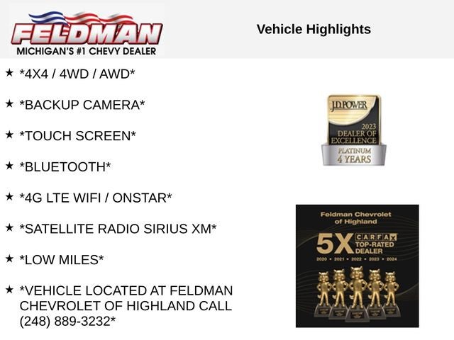 *4X4 / 4WD / AWD*, *BACKUP CAMERA*, *TOUCH SCREEN*, *Bluetooth®*, *4G LTE WIFI / ONSTAR*, *SATELLITE RADIO SIRIUS XM*, *LOW MILES*, *VEHICLE LOCATED AT FELDMAN CHEVROLET OF HIGHLAND CALL (248) 889-3232*, *GENERAL MOTORS AWARD TOP CUSTOMER SERVICE DEALERSHIP IN METRO DETROIT*, 4WD.