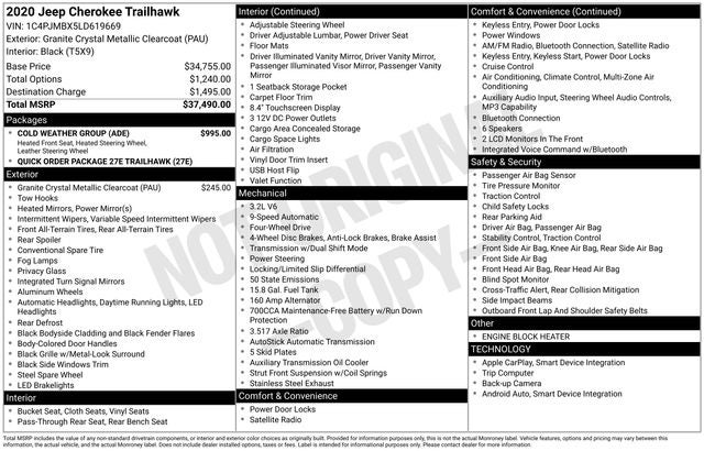 Granite Crystal Metallic Clearcoat 2020 Jeep Cherokee Trailhawk 4WD 9-Speed 948TE Automatic 3.2L V6
